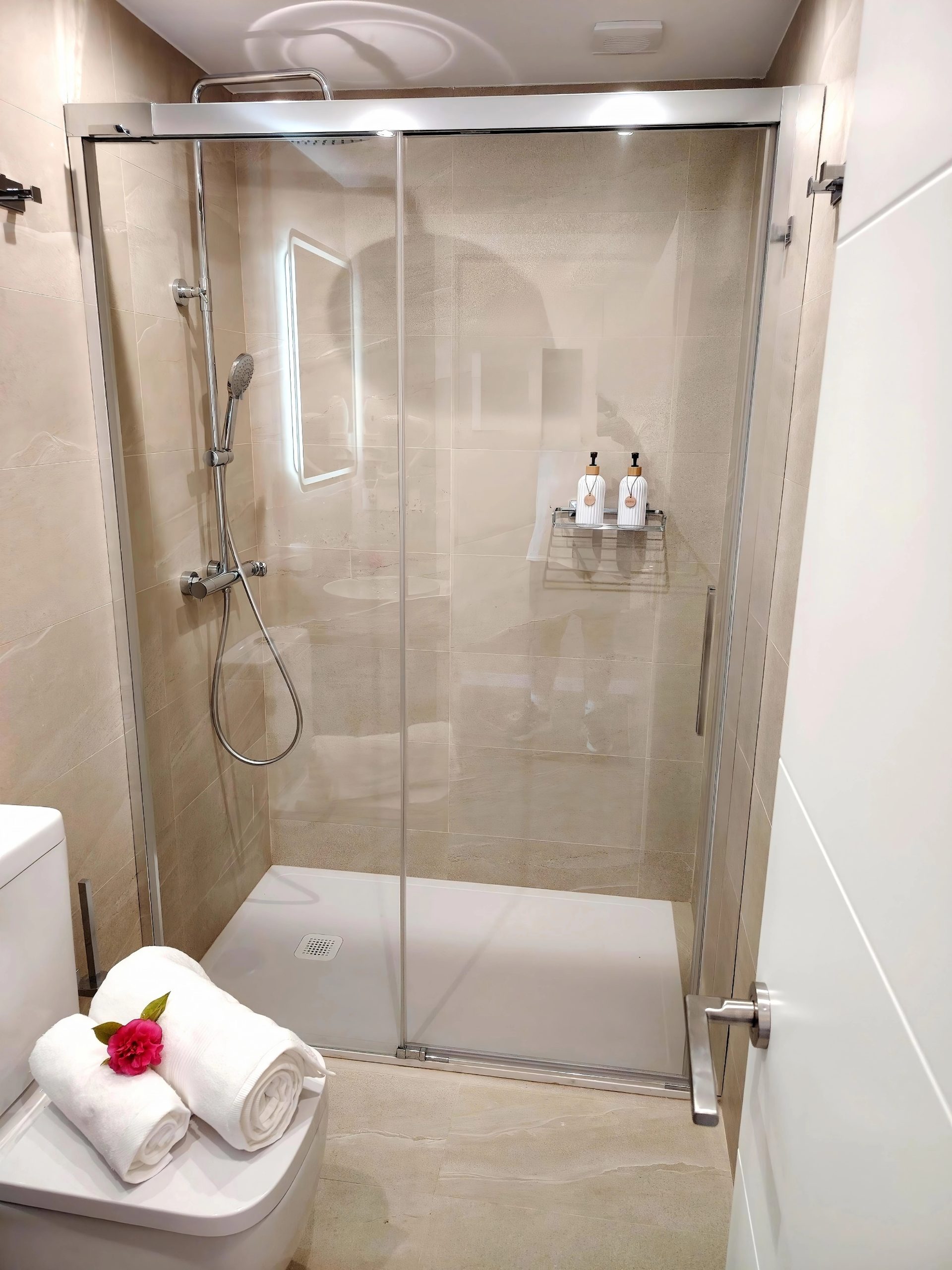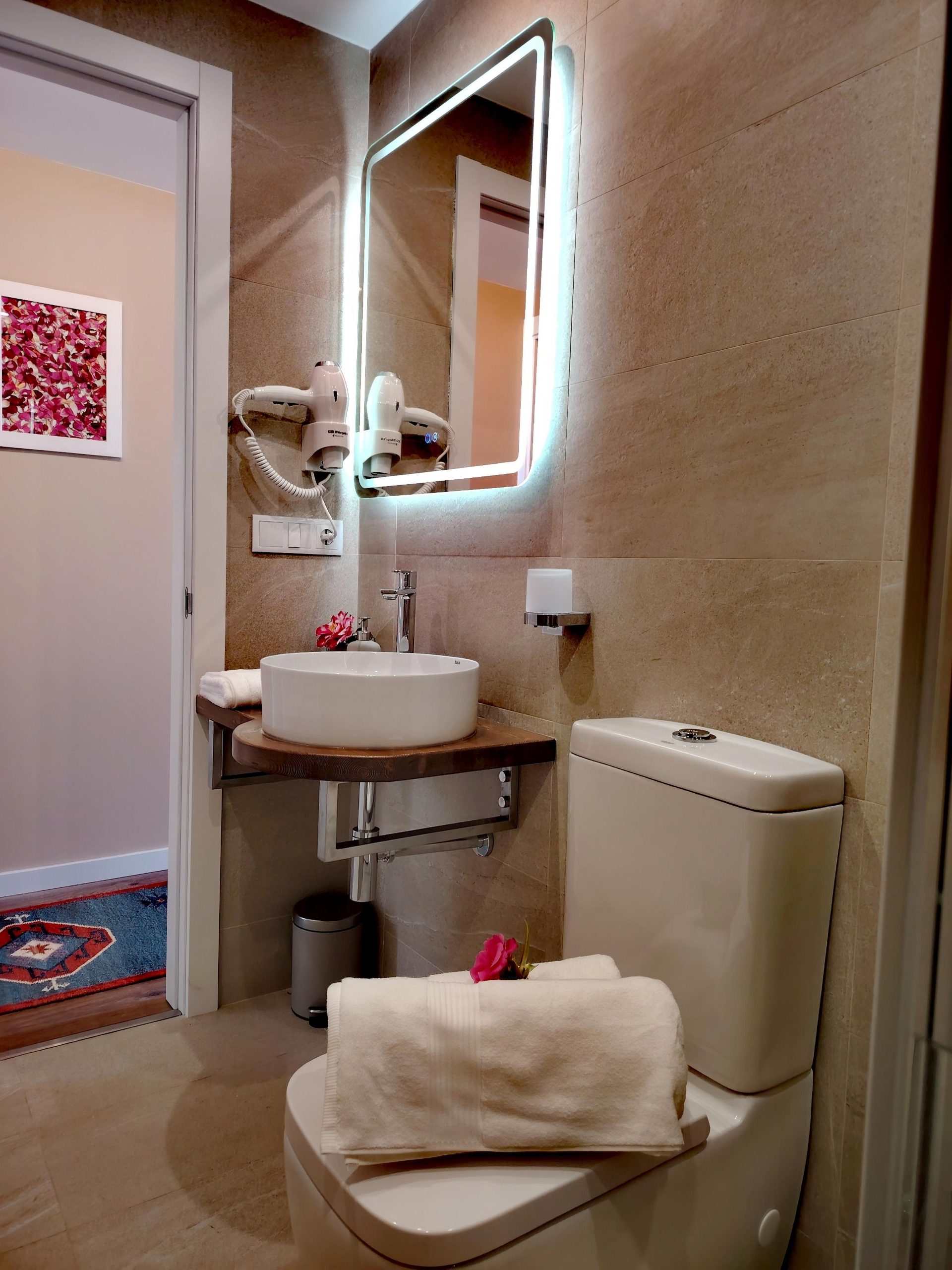 • Baño Premium: Un cuarto de baño contemporáneo con ducha de efecto lluvia, lavabo sobre encimera de madera, secador de pelo y un gran espejo calefactable y con iluminación LED perimetral.