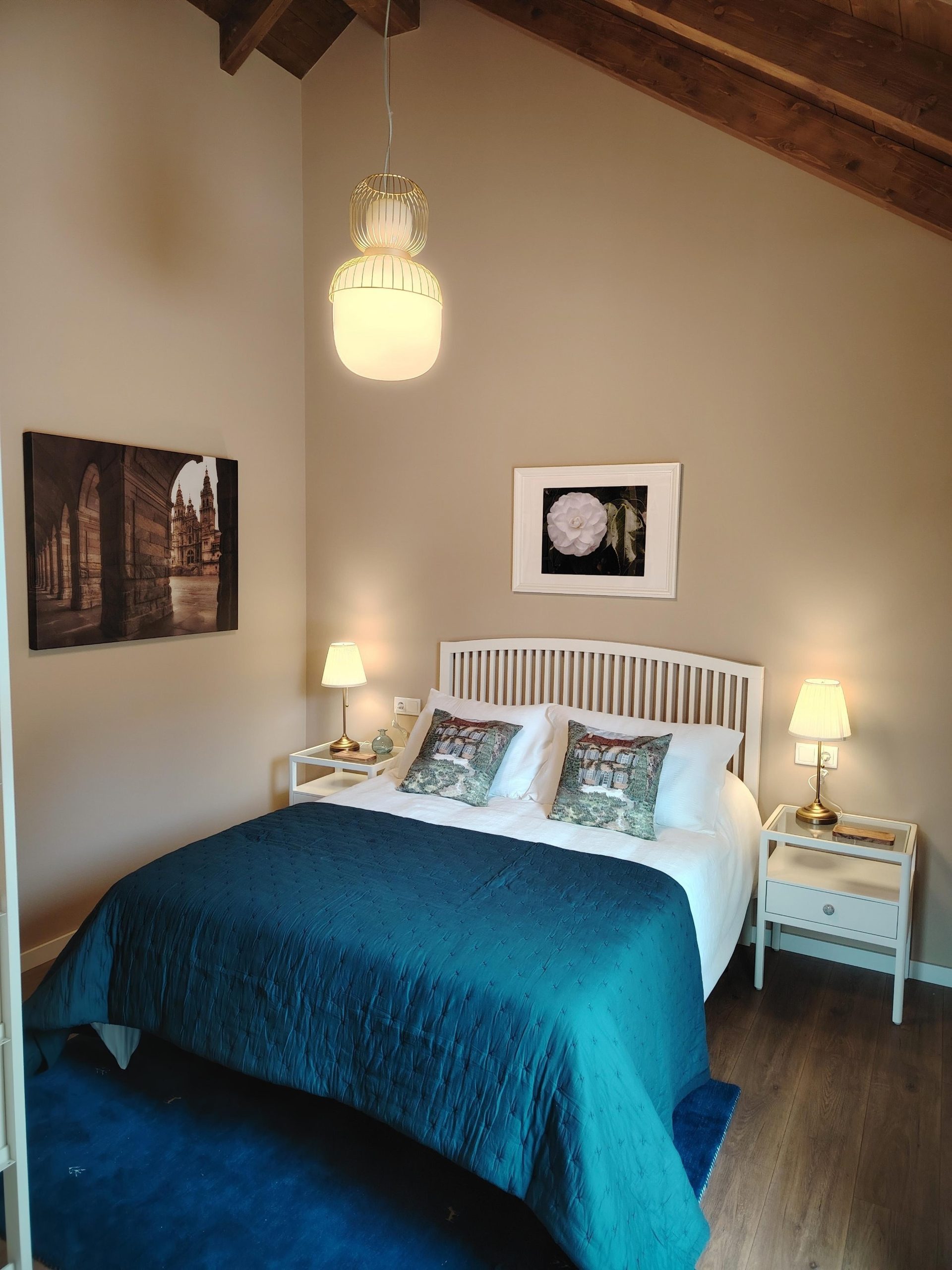 - Descanso adaptable: Disponemos de dos dormitorios cuidadosamente decorados. Una habitación principal con cama Queen Size y detalles textiles de alta calidad en azul profundo, y un segundo dormitorio con literas, ideal para familias.