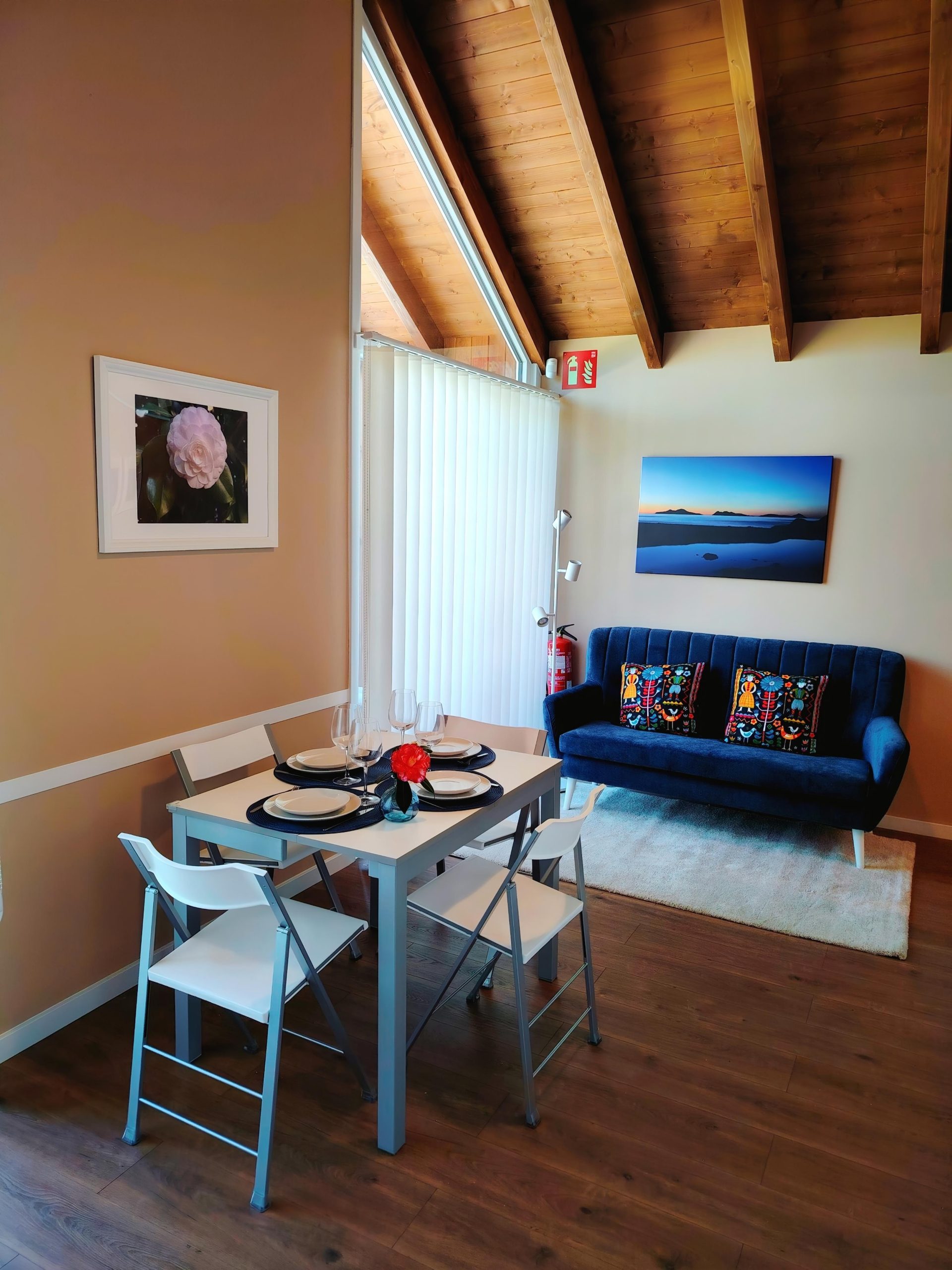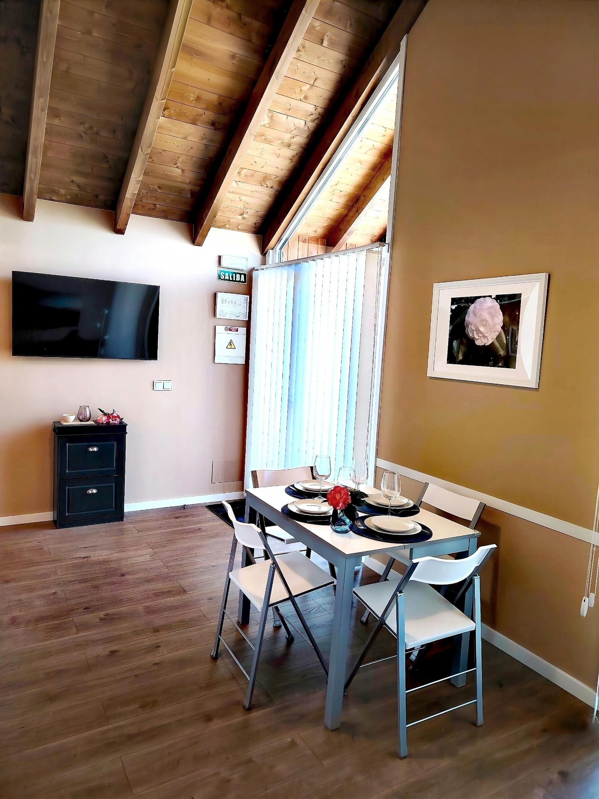 - Zona social integrada: Un salón bañado por la luz natural con techos de doble altura y vigas vistas que crean una sensación de amplitud única. Relájate en nuestro sofá aterciopelado mientras disfrutas de tus series y películas favoritas en una Smart TV de grandes dimensiones. Mantente siempre conectado con nuestra WiFi de alta velocidad gratuita.